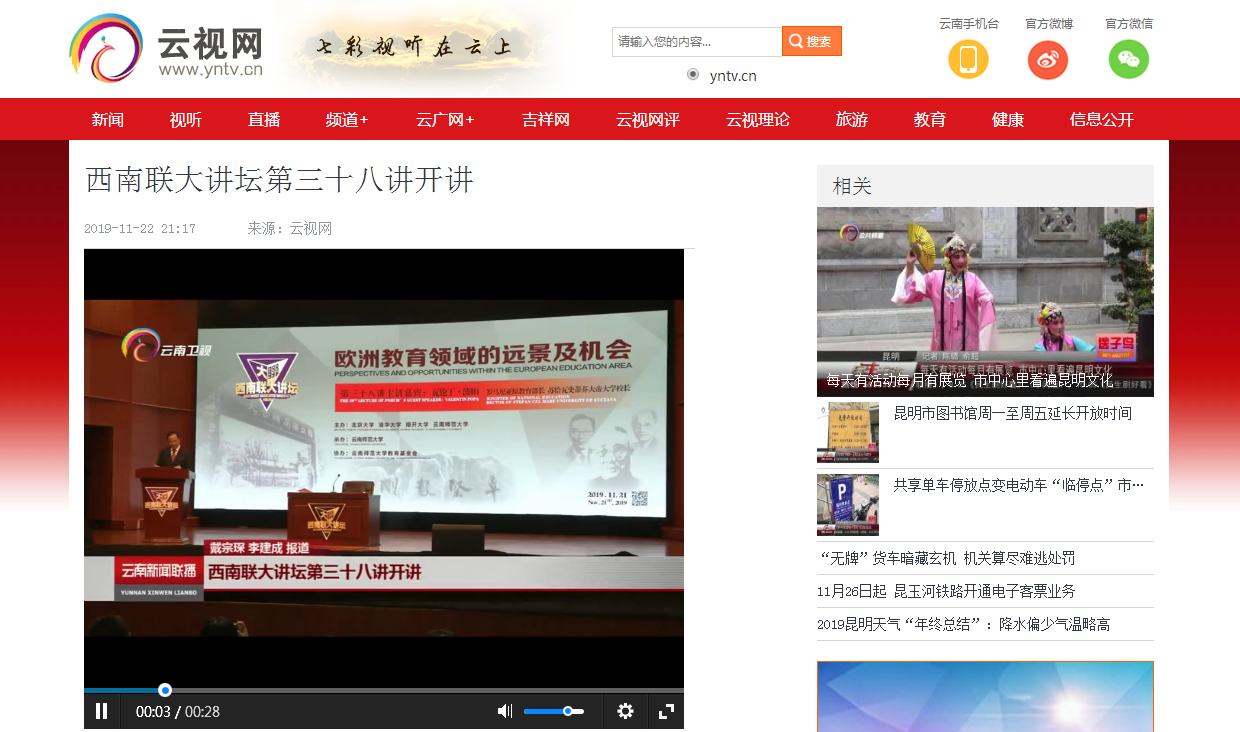 云南新闻联播 2019-11-22 西南联大讲坛第三十八讲开讲