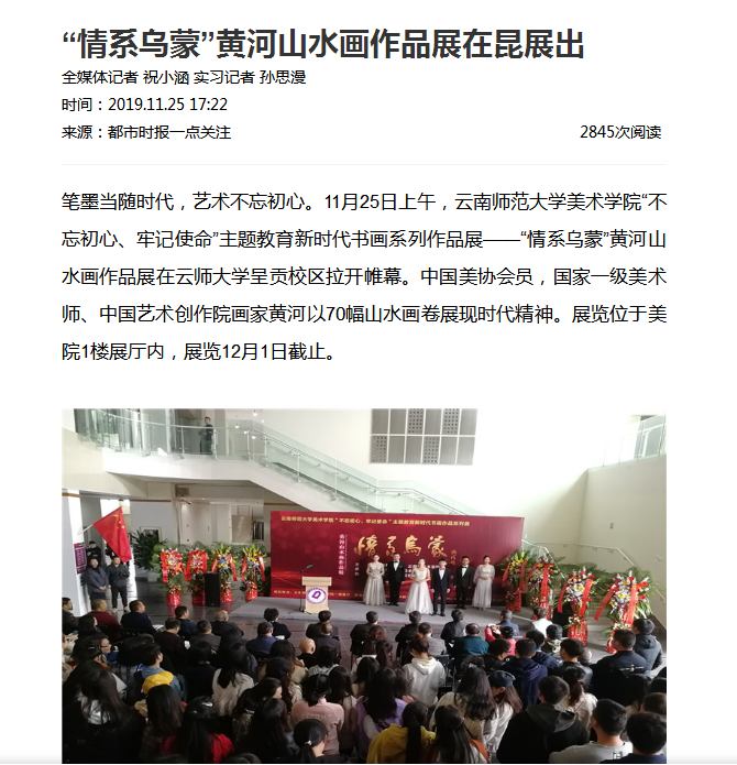 上一条:昆明日报 2019-11-25 情系乌蒙!云南画家黄河山水画作品展在昆开展 下一条:今日头条 2019-11-25 “情系乌蒙”黄河山水画作品展在云南师范大学开展