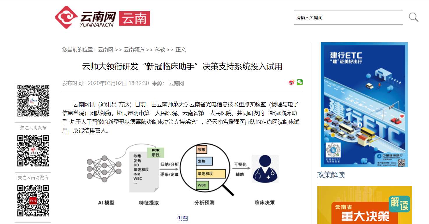 上一条:学习强国 2020-03-02 云南师范大学领衔研发的新型冠状病毒肺炎临床决策支持系统投入试用 下一条:新华网 2020-02-28 云南师大领衔研发的新型冠状病毒肺炎临床决策支持系统投入试用