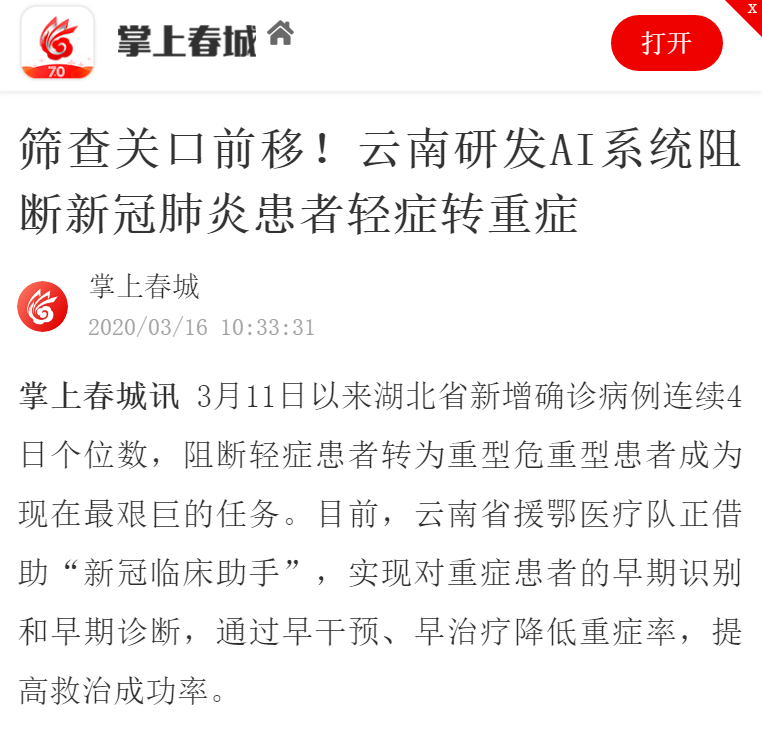 昆明日报 2020-03-16 筛查关口前移!云南研发AI系统阻断新冠肺炎患者轻症转重症