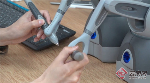 在实验室内,记者注意到了一款特别的设备——Touch力反馈器,一款每秒就能采集700-1000帧的触觉数据。“将这种传感器件安装于弹性结构的被检测处,就可以直接地或通过计算机渲染出具有多维的力和力矩。”邰永航解释道,这样成功采集了所有的力之后建成模型并写进系统中,操作人就能够感受到真实的“力”了。