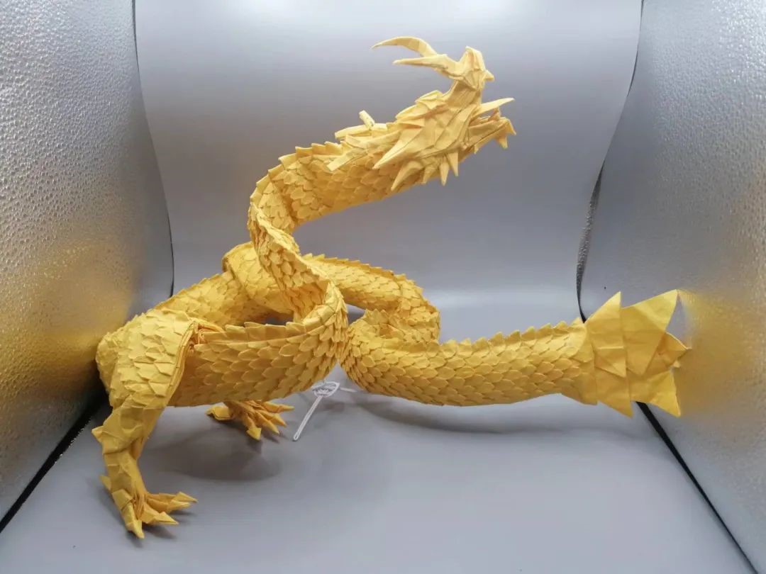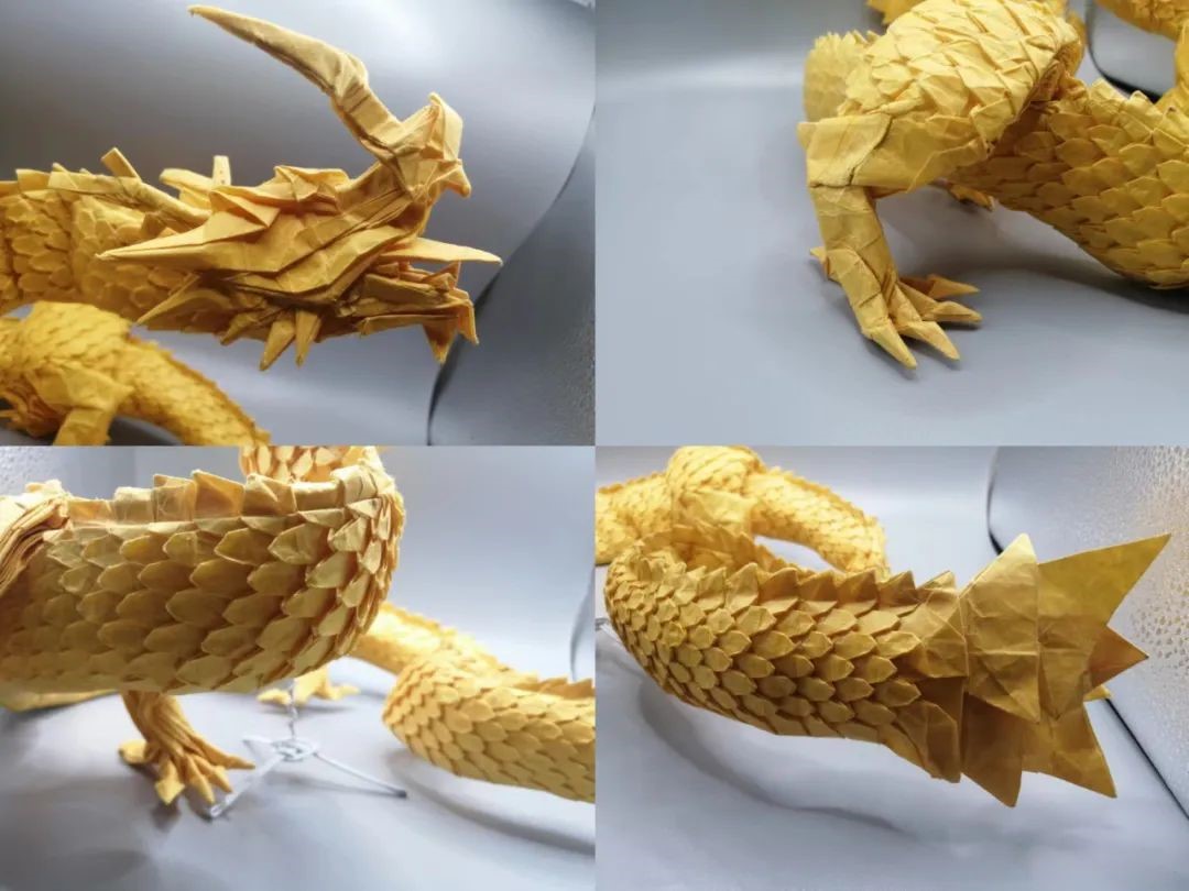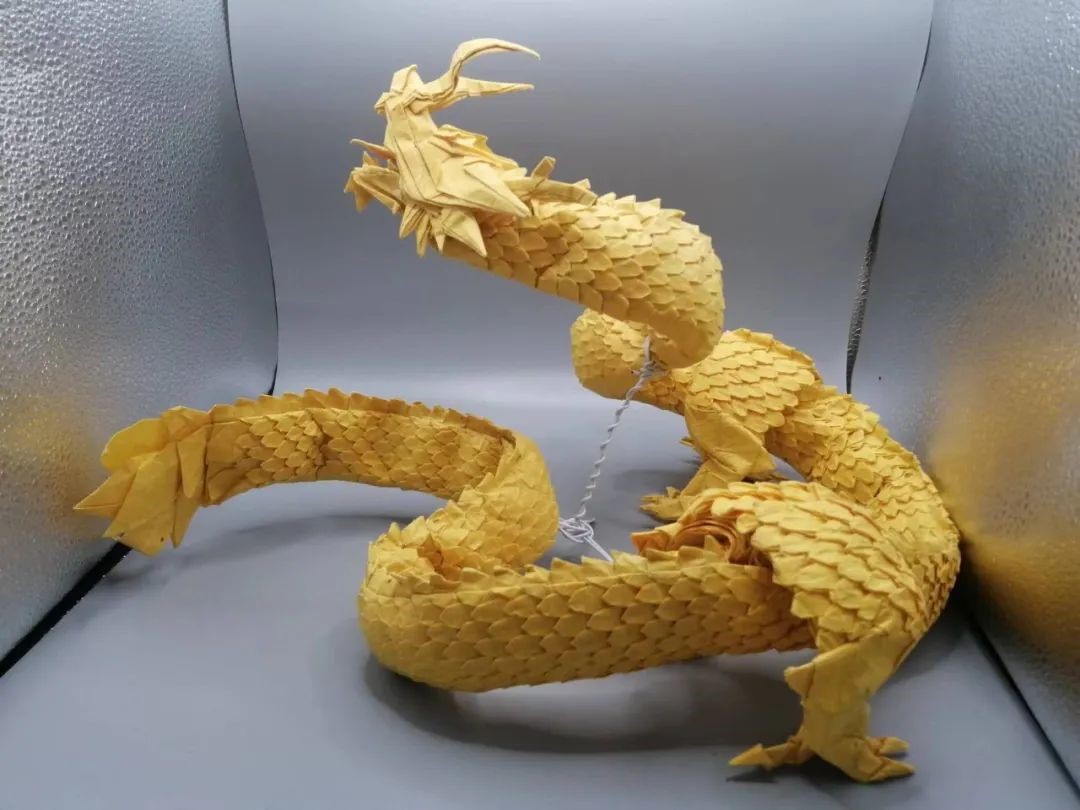 李瑞折的这条龙,叫龙神,用一张边长2米的正方形,黄色油纸折成,呈盘踞造型。龙身长约1.5米,有近1400个鳞片,每个鳞片大小约1平方厘米,细节展现堪比精雕作品。