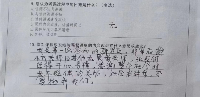 信上说道:老年人是需要社会关心的一个特殊群体,兢兢业业辛苦了一辈子,到了寒花晚节时,更要赶上日新月异的时代脚步,“银发港湾课堂”就像一份“家常菜”成了老年人的日常必需,办实事以心交心、办好事持之以恒,课堂上有一份家的温馨、学知识尝到了家的味道。当天课程结束之后,讲师万江也在他的课件上留下了自己的心语:莫道桑榆晚,为霞尚满天。