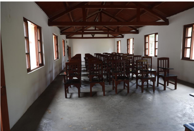 (西南联大旧址教室内摆放整齐的“火腿椅”。)