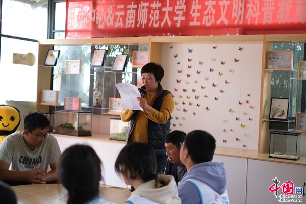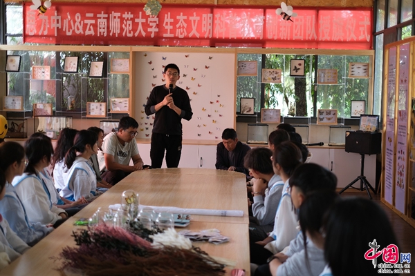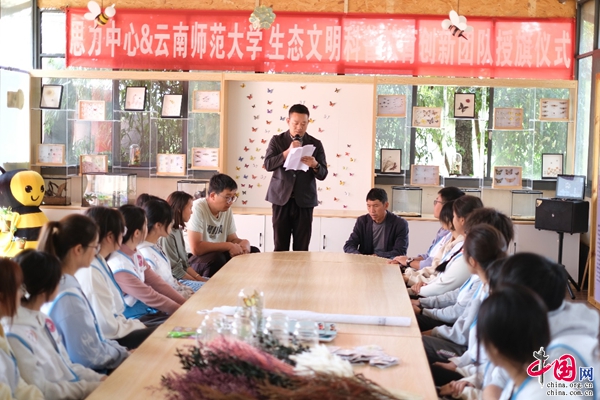 在授旗仪式上,云南师范大学团委副书记苏斌、云南思力生态替代技术中心执行主任左智、寻甸一丘田善态庄园董事长龚艳琼分别致辞,祝贺生态文明科普教育创新团队的正式成立,表示生态文明教育科普实践不仅可以强化青年人对生态文明理念的认识和理解,让生态文明理念成为青年日常生活和学习中的自觉行为,塑造青年正确的生态观;同时,通过富有创意和实践的生态文明教育,可以激发青年的创新能力,培养有担当、有责任感的创新科普教育人才。