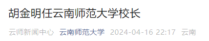 据“云南师范大学”微信公众号消息,4月16日,云南师范大学在呈贡校区汇学楼报告厅召开干部大会,宣布省委对云南师范大学领导干部的任免职决定:胡金明同志任云南师范大学党委副书记、校长,不再担任云南大学党委常委、副校长职务;免去王德强同志云南师范大学党委副书记、校长职务,保留正厅长级待遇。