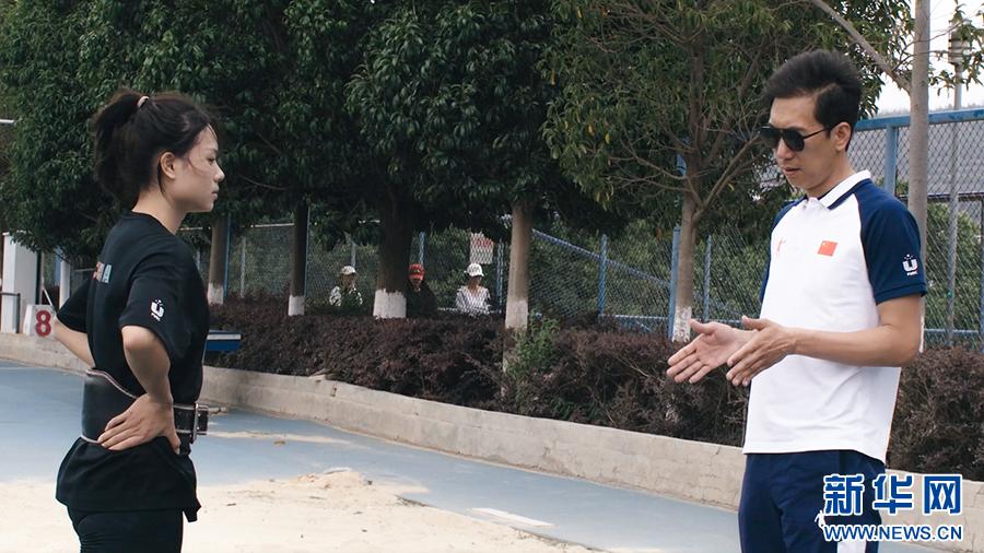 教练杨帆(右)正在为江南(左)纠正训练动作(资料图)。新华网发(云南师范大学 供图)