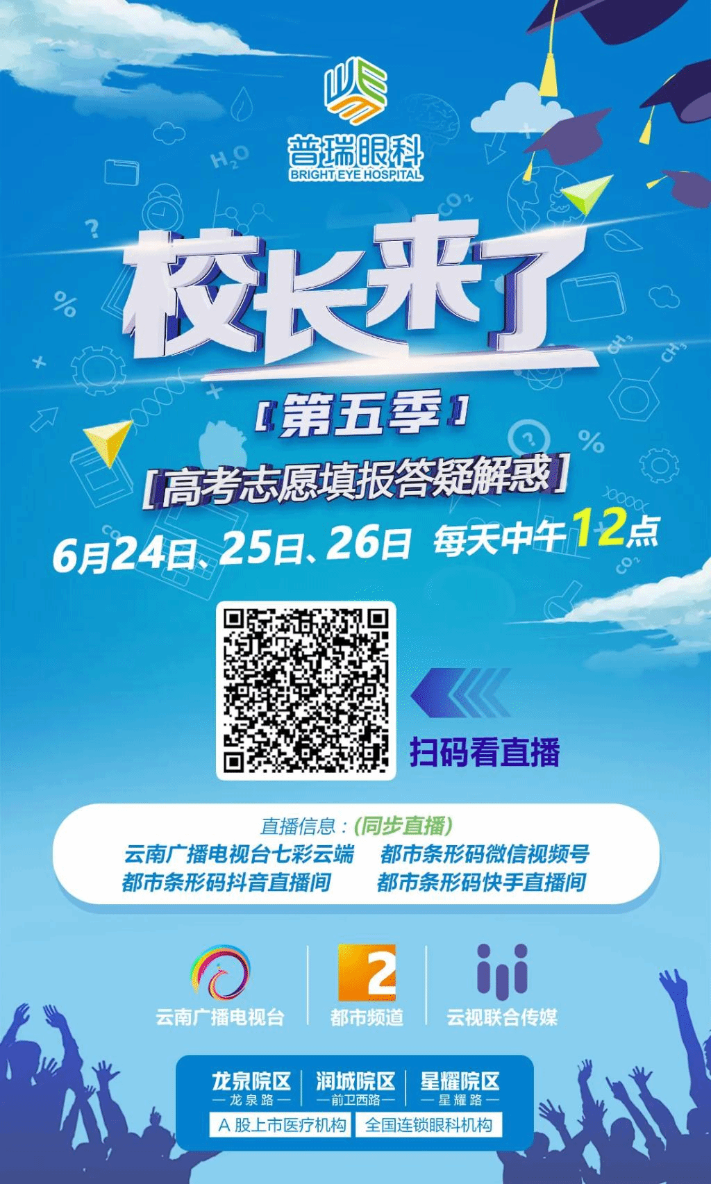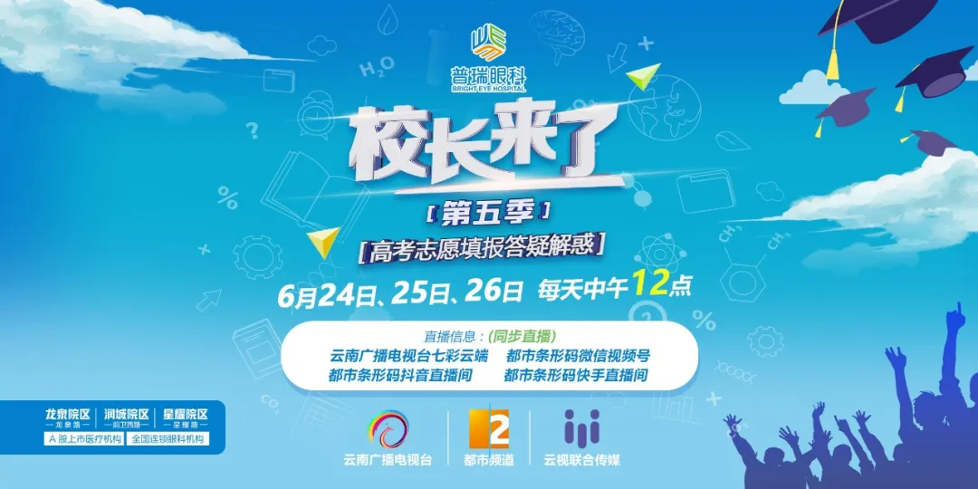 从6月24日开始,由云南广播电视台都市频道倾力打造的《校长来了》第五季正式启动,我们将邀请云南多所大学负责人走进演播室,与主持人以新媒体直播访谈的形式,为考生和家长提供最权威的高考志愿填报指南。