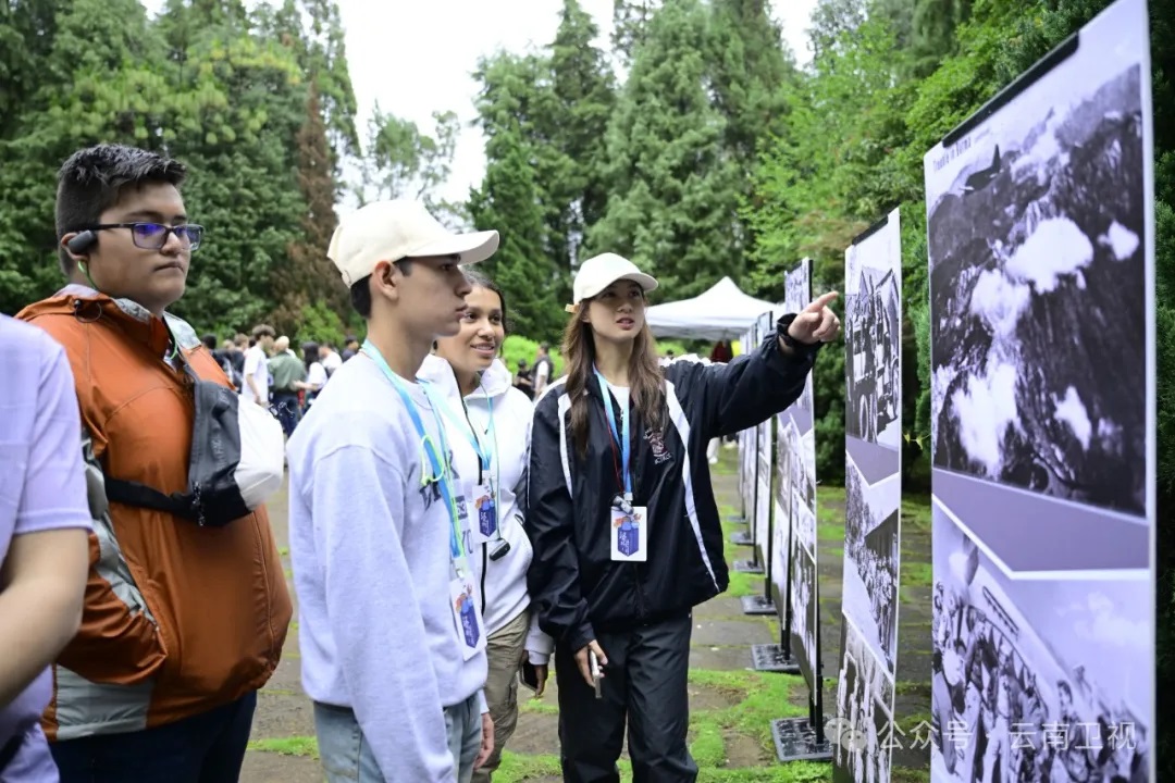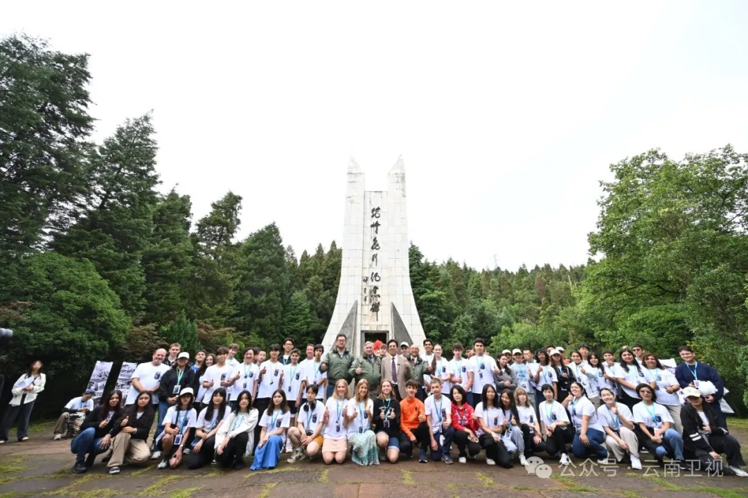 628日清晨,昆明郊野公园笼罩在蒙蒙细雨之中。在位于公园高处的驼峰飞行纪念碑前,汉语桥——‘飞虎队主题美国青少年来华夏令营70名营员拾级而上,一起缅怀83年前的驼峰飞行