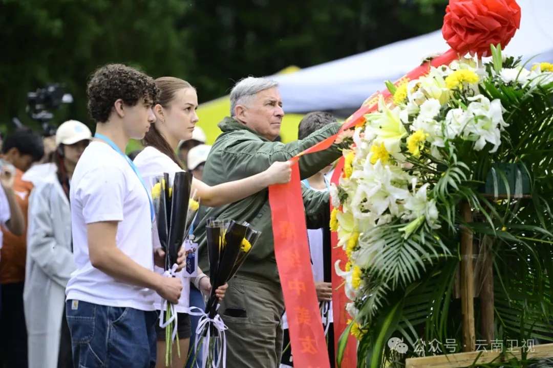 为纪念牺牲的英雄,美中航空遗产基金会主席杰弗里·格林带领参加夏令营的美国青少年以及到场的中美来宾向逝去的英雄们鞠躬默哀,并敬献花篮。随后,营员们依次来到碑前,以一支支菊花寄托哀思。