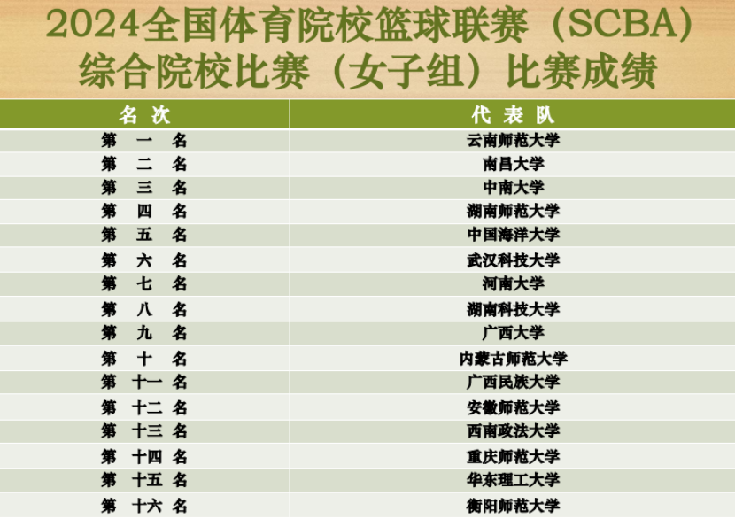 9月27日,2024年全国体育院校篮球联赛(SCBA)综合院校比赛女子组决赛在四川省宜宾市南溪区文体中心落幕。云南师范大学代表队以69比53击败南昌大学代表队,摘得女子组桂冠,教练欧阳宇华获最佳教练员,队员娜汉获女子组MVP。