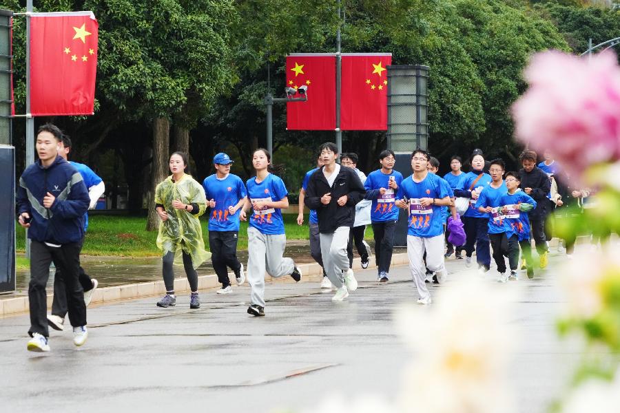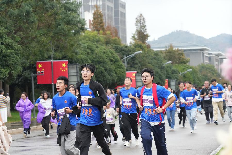 此时天空中下着小雨,但运动员们精神焕发、信心满满,大家在雨中热情奔跑,展现了新时代青年的活力与风采。