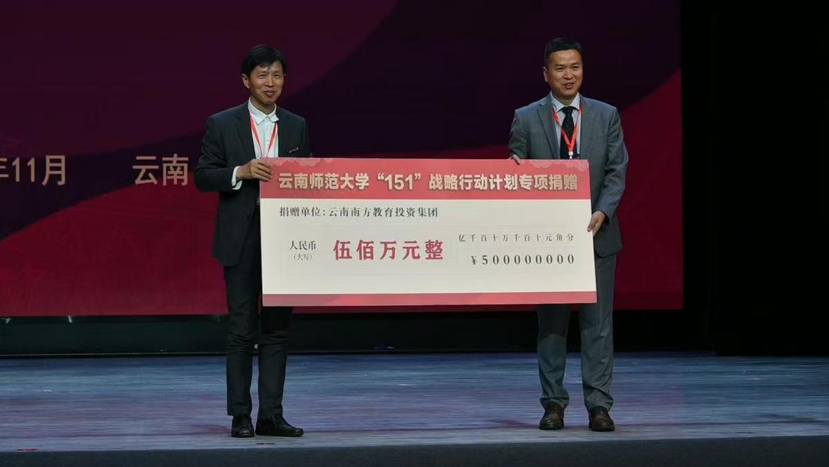 云南师范大学1981级物理系校友,云南南方教育投资集团董事长兰靖、2014级艺术学院校友、铭辛天润集团董事长崔润分别向学校捐赠人民币五百万元和三百万元,用于支持学校建设发展。校长胡金明代表学校接受捐赠并颁发捐赠证书。