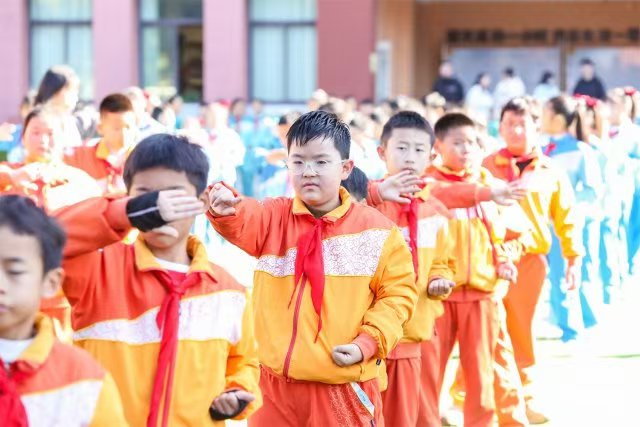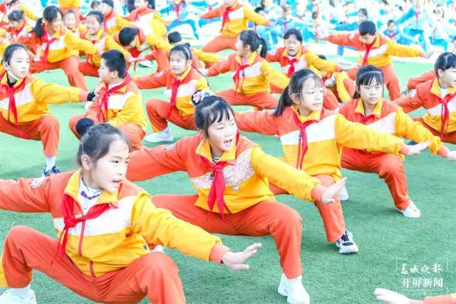 第一堂展示课结束后,正值学校大课间活动时间,该校的同学们身着七彩校服,在欢快的音乐声中,投入到丰富多彩的大课间活动中。该校大课间的编排汲取了中华优秀传统文化的精髓,包括舞旗、舞扇、舞龙、舞狮、五禽戏和武术等元素。该校体育组的老师们将这些具有传统文化元素与民族特色的活动,进行巧妙结合,每个年级的学生还以不同的民族乐器,民族舞蹈的形式,生动展现了中华民族多元文化的独特魅力,让整个大课间活动成为了文化交流的平台。