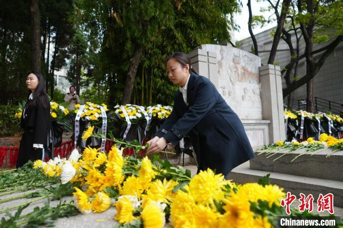 4月3日,云南昆明,市民向烈士敬献鲜花。当日,社会各界人士齐聚云南师范大学,在西南联大旧址的 "一二·一" 四烈士墓前,举行 "清明祭英烈" 活动,共同追思为民族独立、人民解放而献出生命的烈士们。中新社记者 刘冉阳 摄