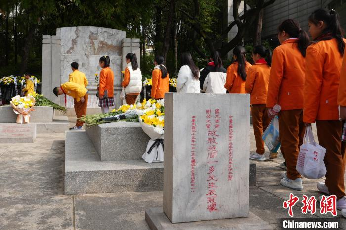 4月3日,云南昆明,社会各界人士齐聚云南师范大学,在西南联大旧址的 "一二·一" 四烈士墓前,举行 "清明祭英烈" 活动,共同追思为民族独立、人民解放而献出生命的烈士们。中新社记者 刘冉阳 摄