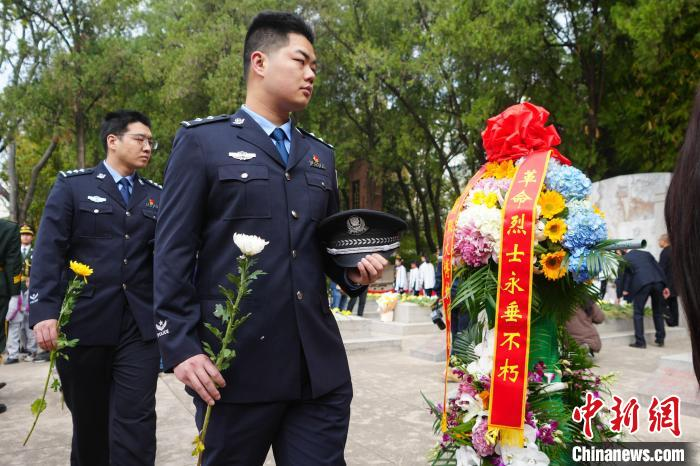 4月3日,云南昆明,警察向烈士敬献鲜花。当日,社会各界人士齐聚云南师范大学,在西南联大旧址的 "一二·一" 四烈士墓前,举行 "清明祭英烈" 活动,共同追思为民族独立、人民解放而献出生命的烈士们。中新社记者 刘冉阳 摄