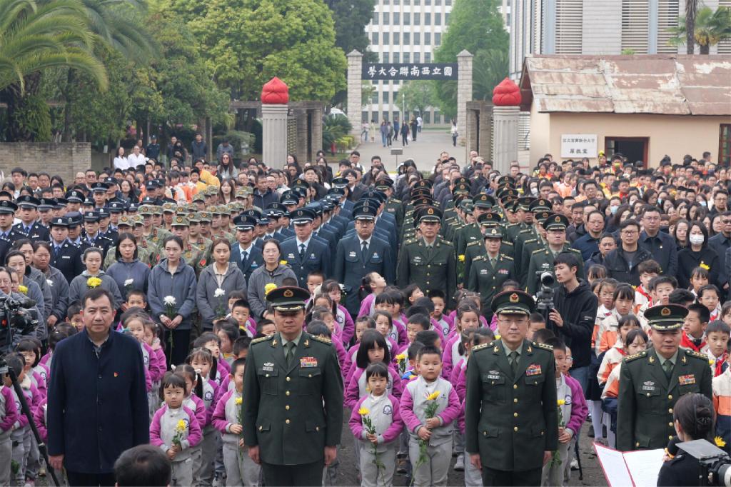 随后,昆明警备区、昆明市退役军人事务局、昆明铁路公安局、昆明市松华坝水库管理处、滇池学院、富滇银行昆明岔街支行、云南师范大学幼儿园、云南师范大学附属七彩云南幼儿园、云南师范大学附属呈贡幼儿园、云南师范大学实验中学、昆明市呈贡区云大附中呈贡中学、昆明市五华区莲华小学、南站小学、西南联大博物馆全体教职工、西南联大博物馆学生志愿者讲解队等单位依次缓步上前,瞻仰烈士墓并向烈士敬献鲜花。