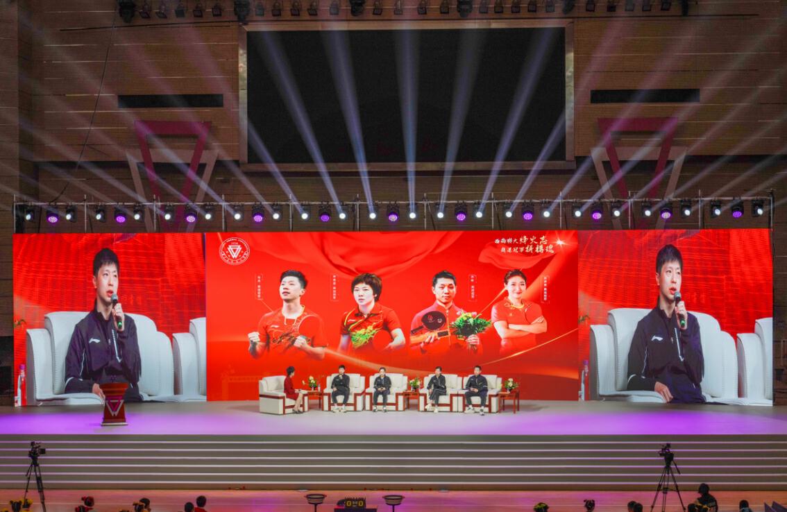 还有学生问道:“龙队,你比赛后夺冠的庆祝动作是突然想到的,还是赛前就想好的?”马龙幽默地说道:“有些动作是当时太激动,自然而然就做出来了。像2018年瑞典世乒赛上夺冠后抱孩子的动作,就是想到就做了,也没想到会引起这么大的反响。”他的回答引得师生笑声阵阵,也让学生们看到了奥运冠军可爱、真实的一面。