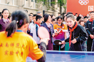 刘诗雯与云南师范大学实验中学学生进行乒乓球友谊赛。