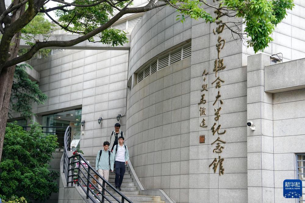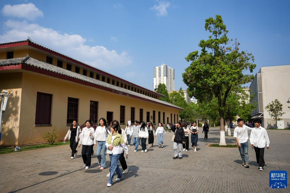 2025年4月10日,在云南师范大学,学生们从西南联大纪念馆走出。新华社记者 陈欣波 摄