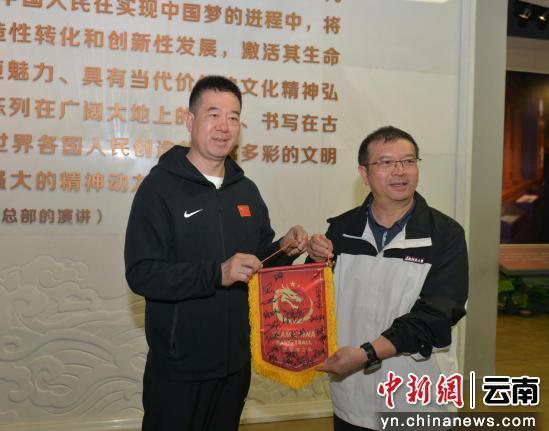 参观结束后,中国篮球协会领队柴文胜将队旗赠与云南师范大学西南联大博物馆,云南师范大学副校长牛治亮代表学校回赠纪念品。