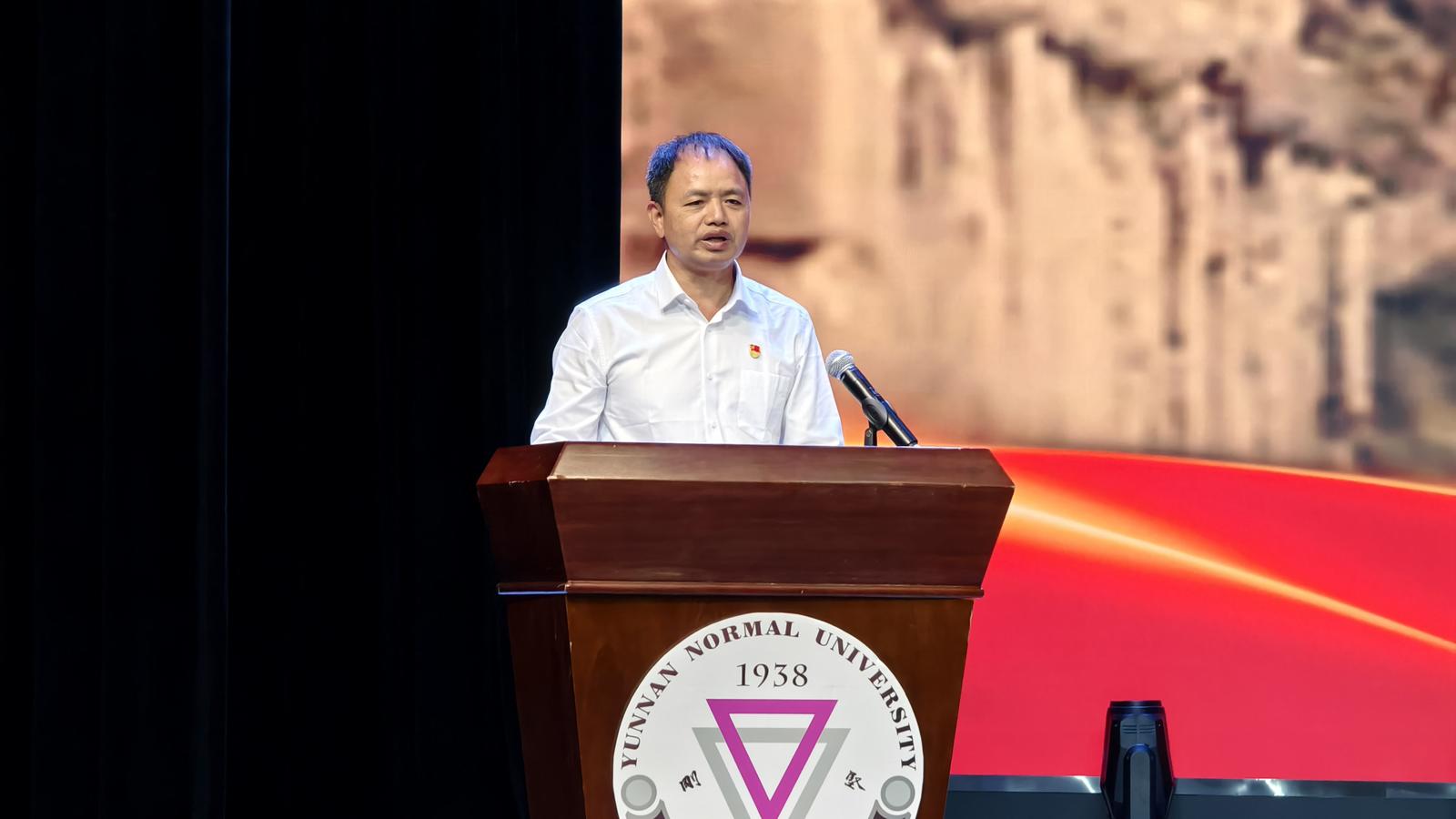 当天下午,云南师范大学演播厅里座无虚席,500余名师生齐聚一堂,共同聆听全国教书育人楷模农加贵老师坚守大山的故事。宣讲会上,报告团成员用真挚的情感和生动的语言,讲述了农老师39年来在教育岗位上的坚守与奉献。他扎根偏远山区,用知识的光芒照亮了无数孩子的未来,用无私的爱心培育了一代又一代的学子。大屏幕上一幅幅照片展示了农加贵老师多年来从事教育工作的瞬间,从扎根偏远山区学校的简陋教室,到与学生们亲切交流的温馨场景;从孤独奋进的身影,到成为育人楷模......每一张照片都仿佛是一个生动的故事,让在场的观众直观地感受到了农老师对教育事业的执着与热爱,现场多次爆发出热烈的掌声。