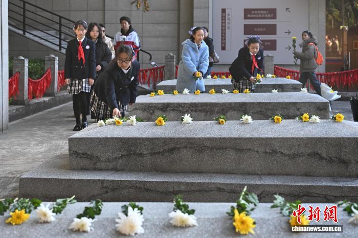 12月1日,小学生在烈士墓敬献鲜花。中新社记者李嘉娴摄