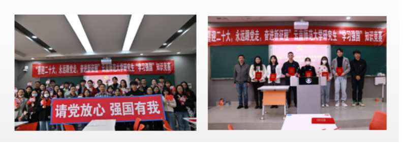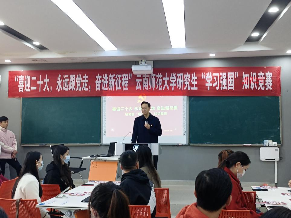 为迎接党的二十大胜利召开,进一步巩固拓展党史学习教育成果,深化“四史”学习教育,激发研究生学习热情,提升思想政治素养,2022年10月14日,由研究生处、校团委组织的“喜迎二十大,永远跟党走,奋进新征程”研究生“学习强国”知识竞赛活动决赛在呈贡校区汇学楼举办。副校长陈正权,研究生处处长黄海涛、副处长范荣康,校团委副书记赵彪及校研究生会、各培养单位参赛选手共600余人参加本次活动。