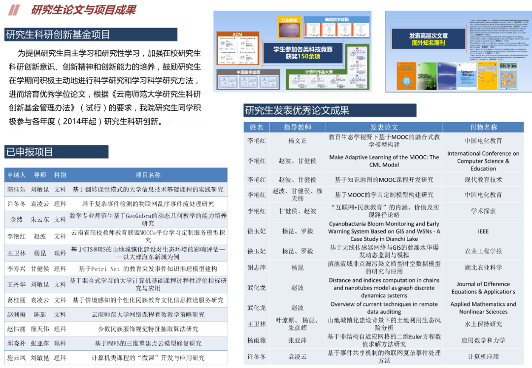 学院将学科建设作为发展的龙头,一体化谋划学科、专业、课程,锲而不舍常抓不懈。一是专业建设取得突破性进展。2019年计算机科学与技术专业获批省级一流专业建设点、2020年获批国家一流专业建设点,2020年教育技术学专业获批省级一流专业建设点,2021年获批人工智能新专业。在2021年云南省本科专业综合评价中,计算机科学与技术专业评价为C+,省内排名第三;教育技术学专业评价为C+,省内排名第一;计算机科学与技术、教育技术学专业在省内师范院校同类专业中具有引领作用。二是优化学科布局。取消1个一级学科硕士学位点和1个专业学位授权点,集中力量办好办强“计算机科学与技术”一级学科硕士学位点和“电子信息”专业学位授权点。根据办学定位、社会需求与学科特色,将“计算机科学与技术”一级学科的培养方向优化为“计算机网络与信息安全”。三是推进本科教学质量工程建设。2门专业核心课程被认定为第一批B级课程,2门课程获省级一流课程建设立项,1门课程被推荐参加国家级评审,4门课程获得校级线下一流课程立项。四是拓展办学渠道,加强校企合作。与科大讯飞股份有限公司开展合作,联合成立云南师范大学人工智能学院。五年来,依托计算机科学与技术一级学科硕士点、教育技术学二级学科博士点,学院形成本-硕-博一体的信息技术专业人才培养体系,为服务云南地方经济社会发展、培养信息技术教育领域高端应用型人才和拔尖科研型人才作出贡献。